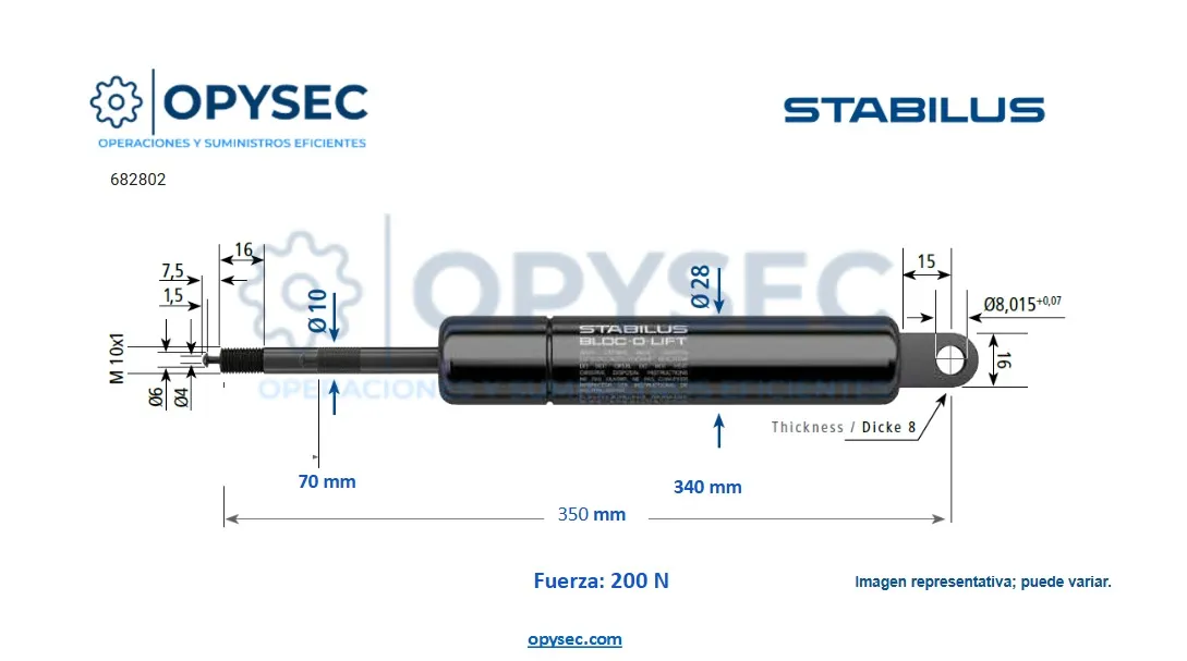 AMORTIGUADOR Bloc o Lift 682802 200N DE FUERZA 350MM LARGO TOTAL, 70MM DE CARRERA