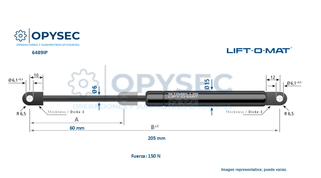 AMORTIGUADOR Lift o Mat 6489IP 150N DE FUERZA 195MM LARGO TOTAL, 60MM DE CARRERA